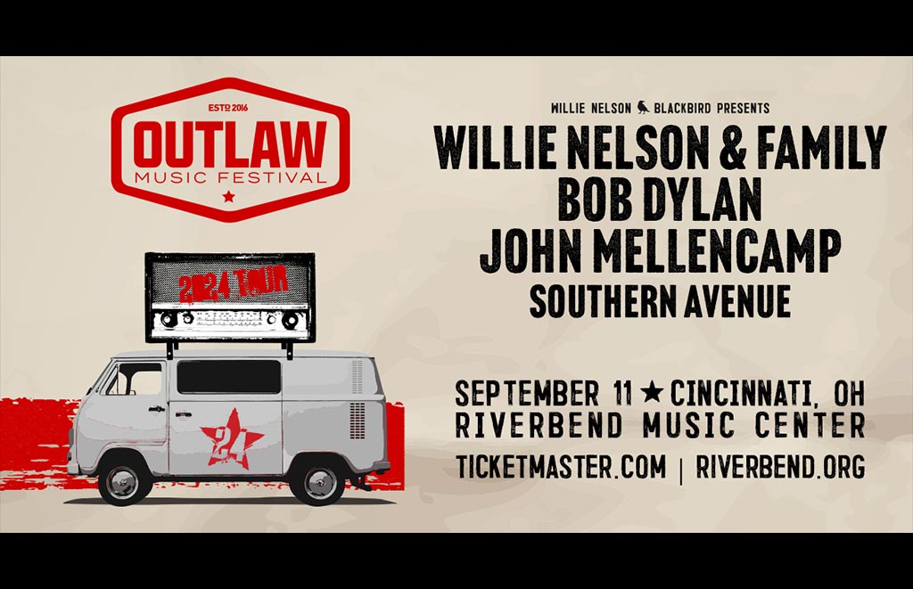 Willie Nelson, Mark Rothbaum, Keith Wortman, Blackbird Presents, Live Nation and Music & Event Management, Inc. are thrilled to announce the 2024 Outlaw Music Festival Tour featuring an unprecedented lineup including headliners Willie Nelson & Family, Bob Dylan, John Mellencamp and Southern Avenue, will make a stop in Cincinnati at Riverbend Music Center on Wednesday, September 11, 2024. Tickets go on sale at 10am on Friday, March 1 at Ticketmaster.com and Riverbend.org.