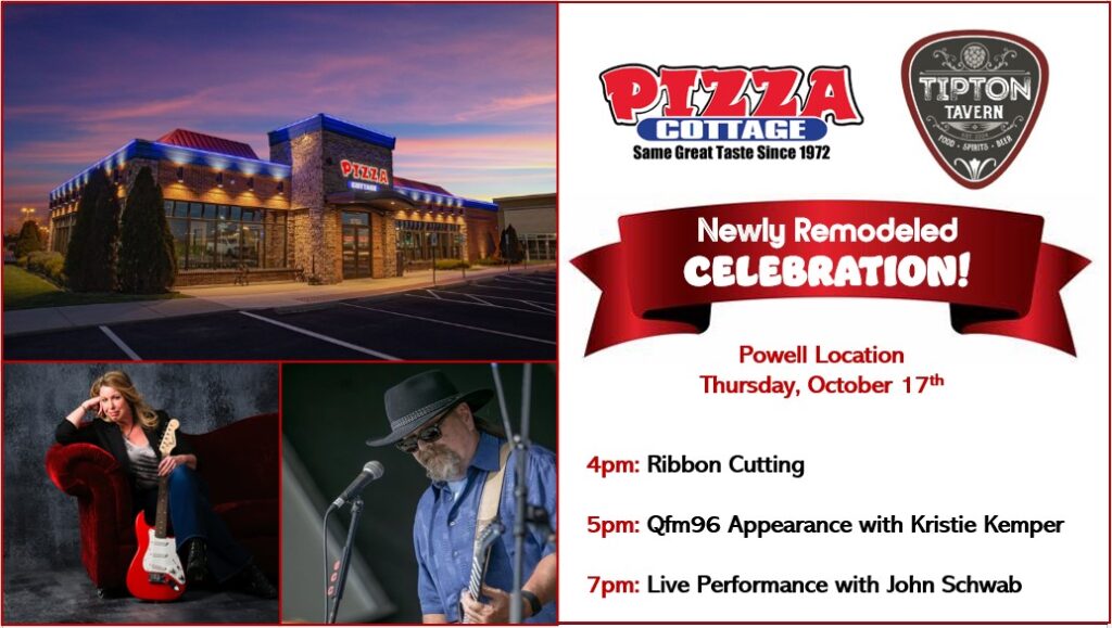 The Celebration begins Thursday, October 17th at 4pm with a ribbon cutting with the Powell Area Chamber of Commerce, followed by a remote appearance with Qfm96’s Kristie Kemper from 5pm to 7pm playing tunes and spinning the prize wheel with great prizes to include discount cards and gift cards to Pizza Cottage! John Schwab will have a special acoustic performance from 7pm-10pm!