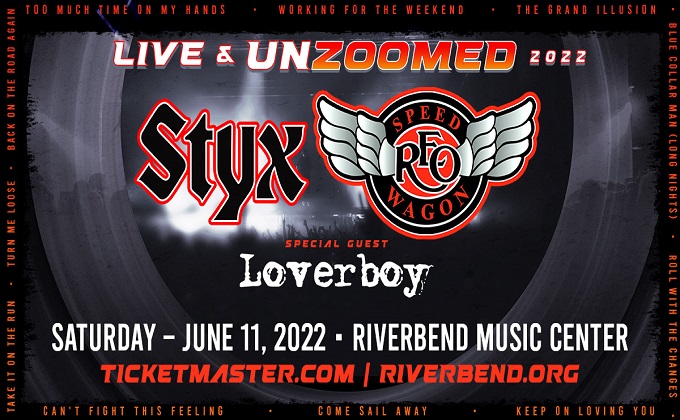 It’s been four years since legendary rockers REO Speedwagon and Styx joined forces for a summer co-headlining tour. While the world has changed since then, fans’ desire to rock out hasn’t. Styx and REO Speedwagon are telling you to close those laptops and get out of your sweatpants, because they’re set to once again bring their rock & roll classics to the masses, this time with special guest Loverboy for the “Live & UnZoomed” tour that kicks off May 31, 2022 in Grand Rapids and will include a stop in Cincinnati, OH at Riverbend Music Center on Saturday, June 11th.